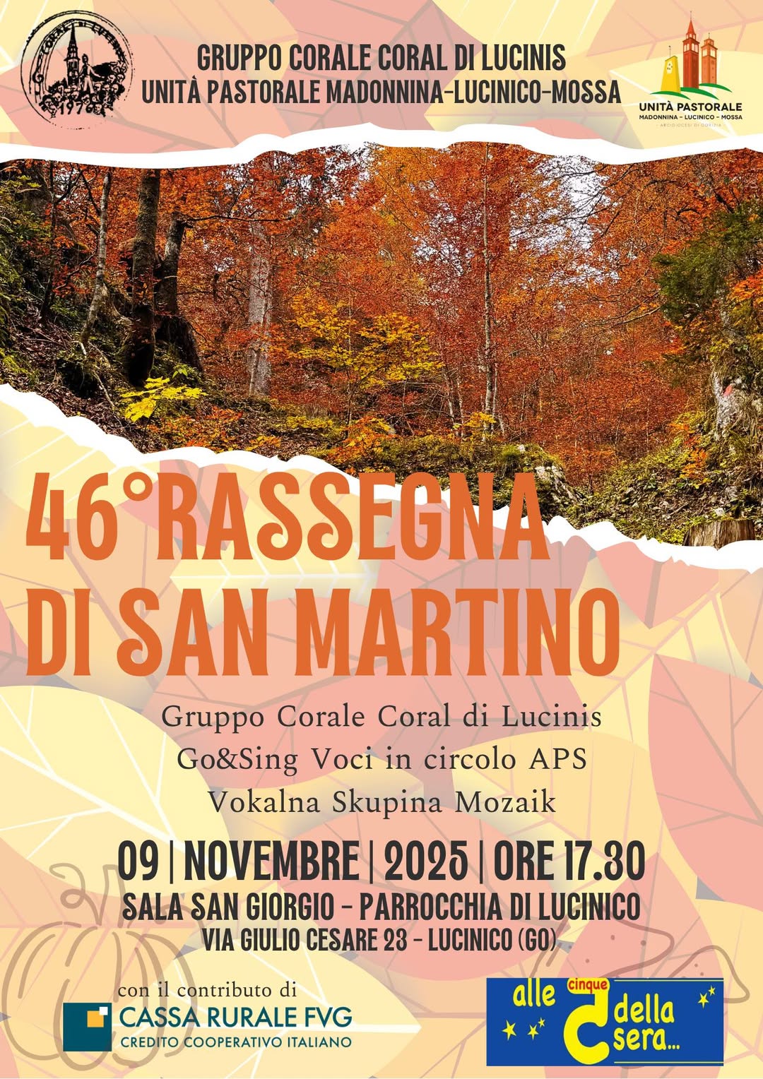 In sala San Giorgio, annuale incontro musicale indetto dal Gruppo Corale Coral di Lucinis, con gli ospiti Go&Sing Voci in circolo APS e Vokalna Skupina Mozaik.