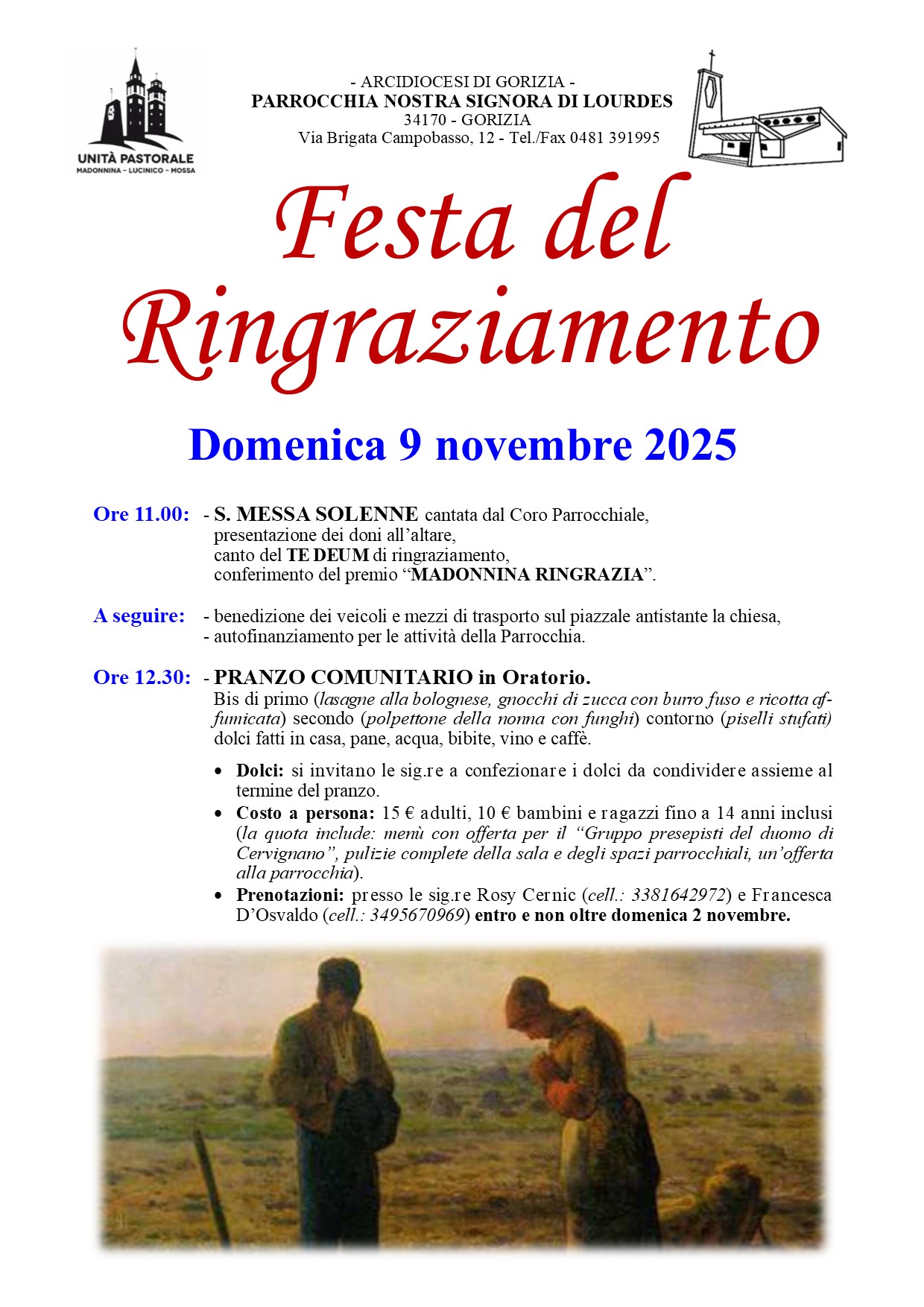 Prenotazioni per il pranzo: presso la sig.ra Rosy Cernic (cell.: 3381642972 ) e Francesca D’Osvaldo (cell.: 3495670969 ) entro domenica 2 novembre.